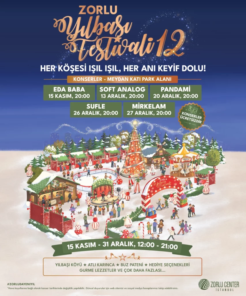 Zorlu Center, one of Istanbul’s most renowned shopping malls, hosts a Christmas Festival throughout the month of December. Visitors can enjoy a full Christmas village, an amusement park, interactive games, and numerous gift stands. This festive market is ideal both for seasonal shopping and for immersing yourself in the joyful end-of-year atmosphere. Entry is free, including for the concerts.