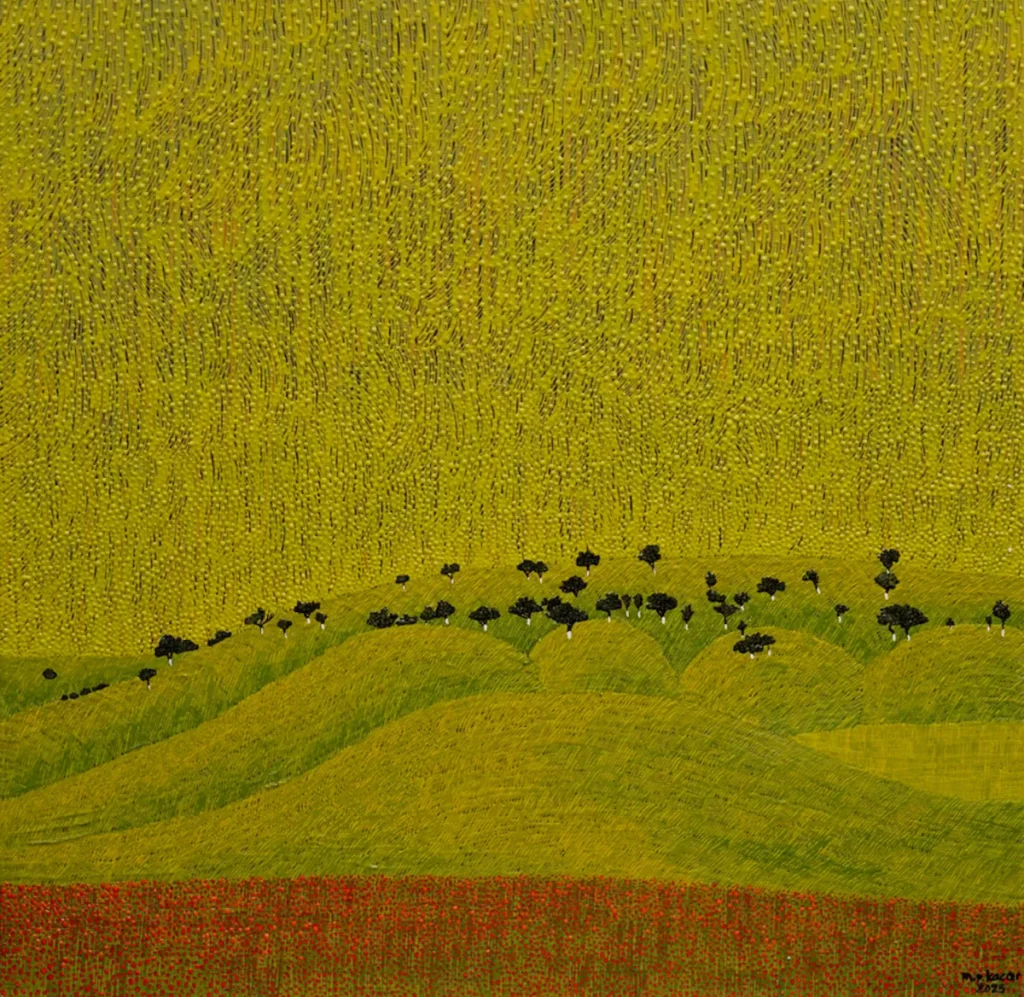 Le travail de Kaçar se déploie dans un ensemble cohérent d’expériences imbriquées, incorporant la nature de sa région natale, les animaux, les récits du quotidien et ses souvenirs d’enfance. Les œuvres se distinguent par des paysages de steppe infinis dominés par toutes les nuances de jaune, ainsi que par une technique distinctive de hachures et de points.